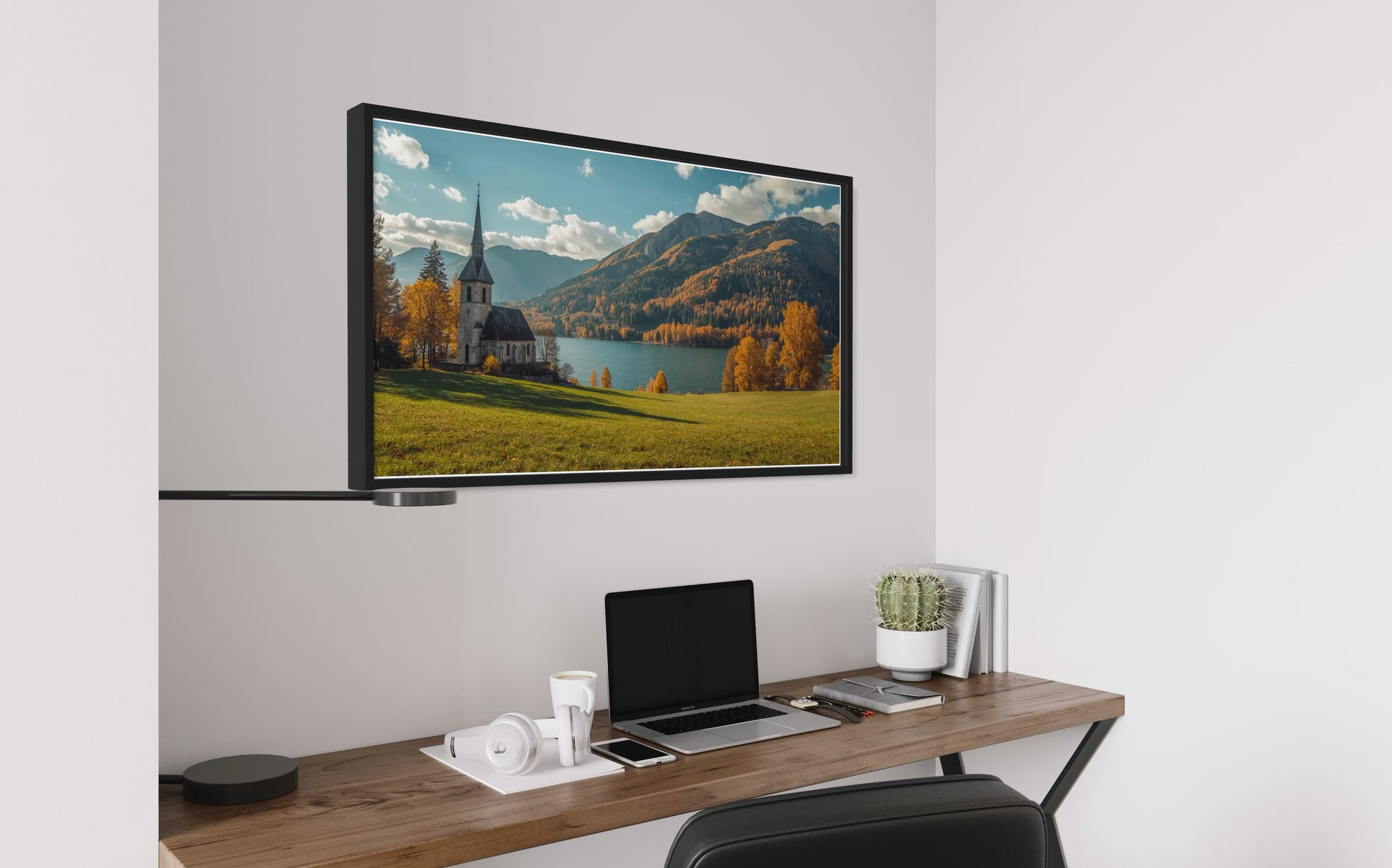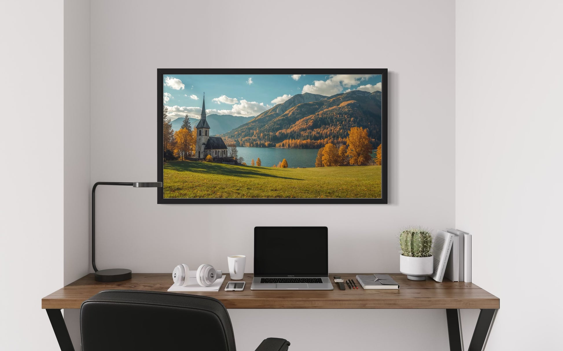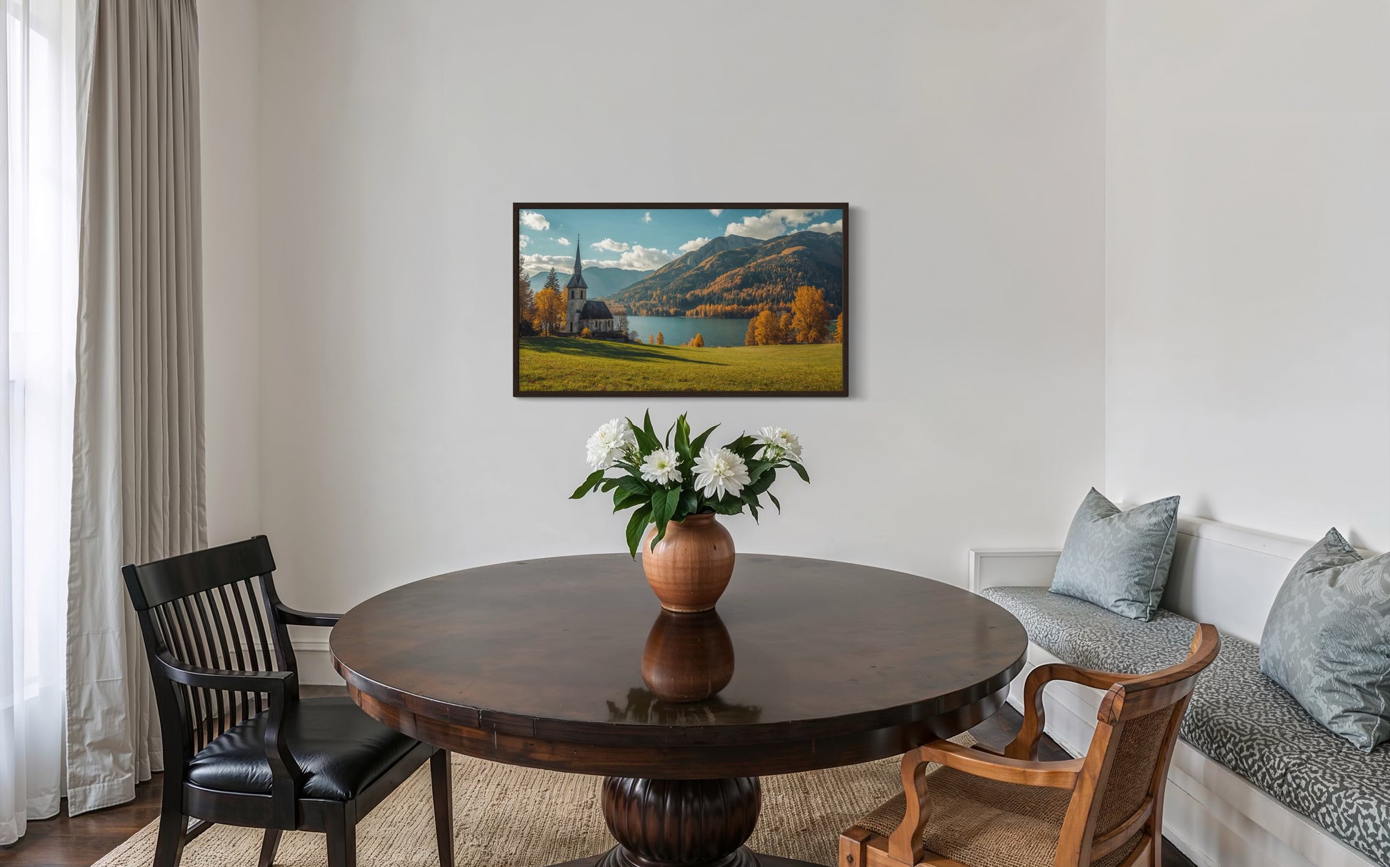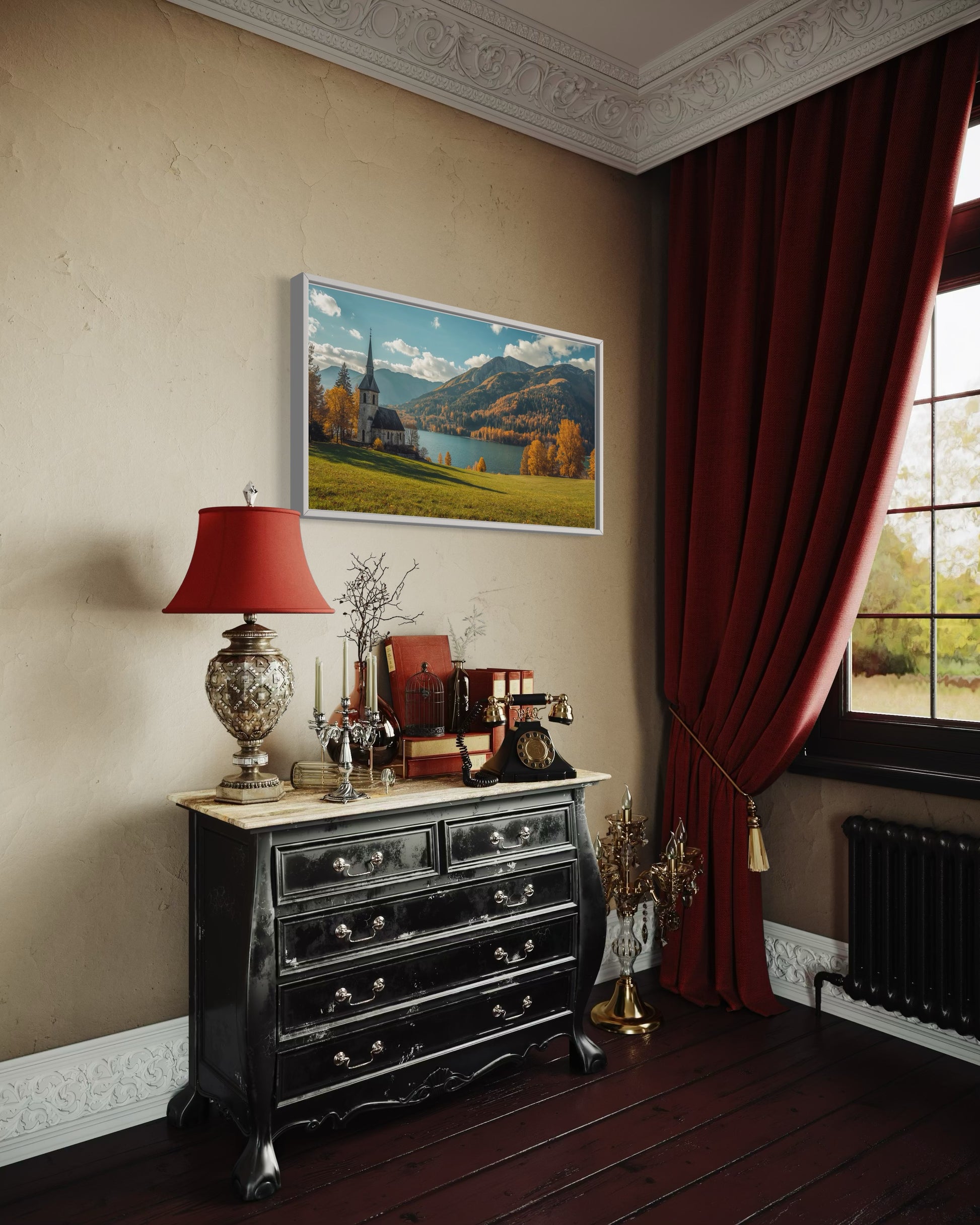 This artwork captures a serene lakeside church surrounded by golden fall trees and majestic mountains. Perfect for adding warmth, depth, and inspiration to any living room, bedroom, or office.