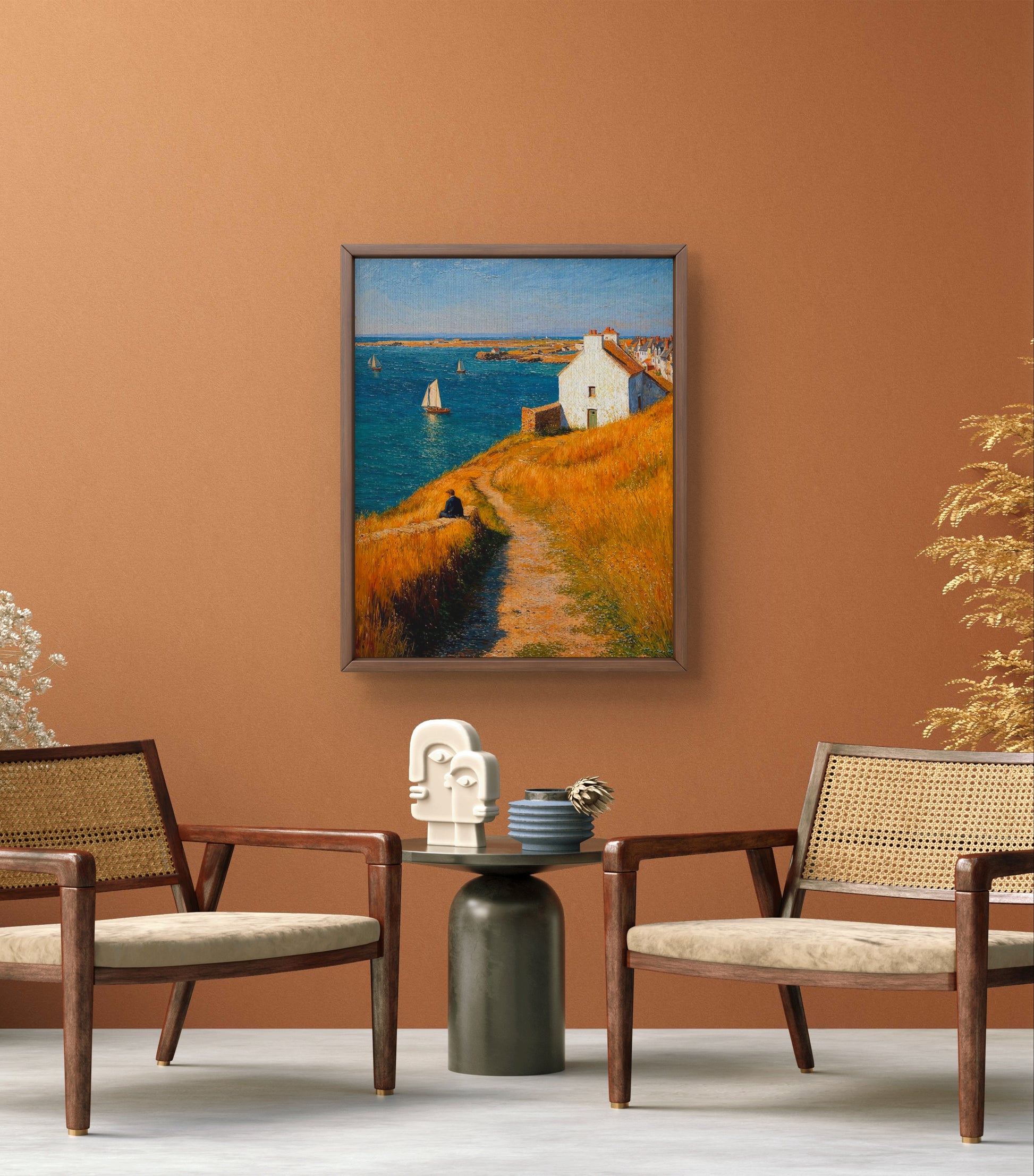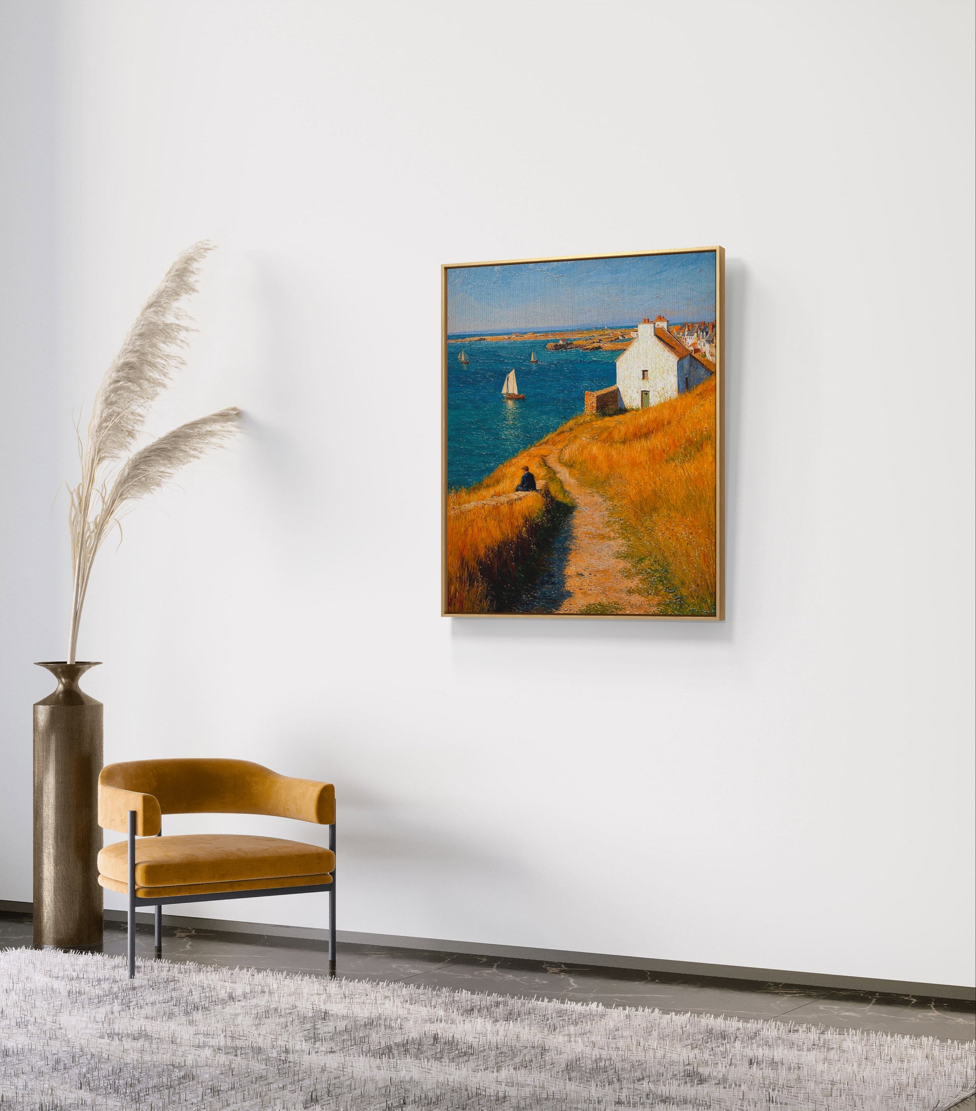 This artwork captures the stillness of a summer afternoon by the coast, where every sailboat drifts like a thought across the horizon, and the gentle wind whispers of home and serenity.