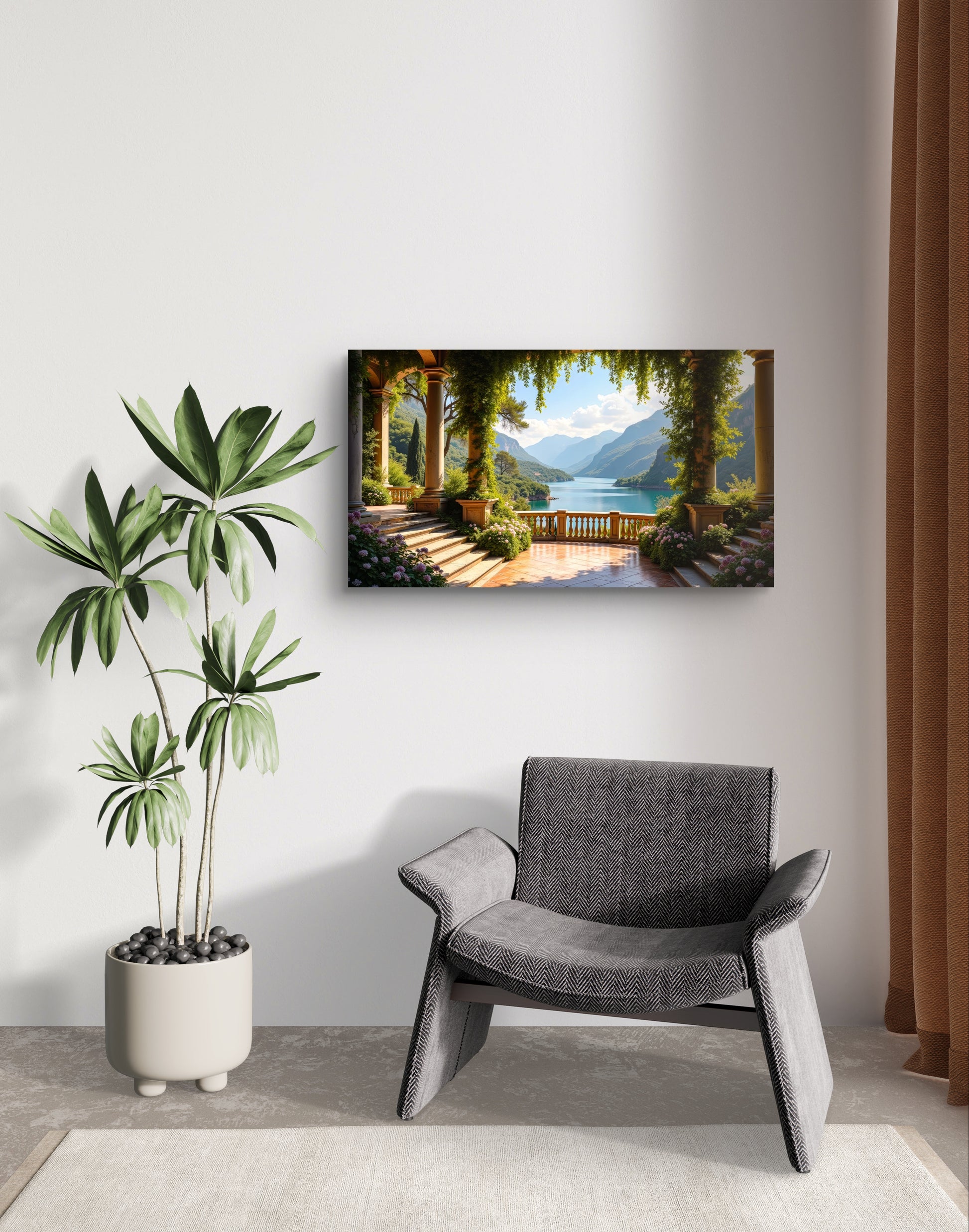 Bring timeless elegance into your space with this Italian terrace artwork. Framed by lush greenery and sunlit columns, the view opens to a serene lake and majestic mountains. The warm terracotta steps and golden tones create a welcoming atmosphere, while the composition adds depth and sophistication to any interior. Perfect for living rooms, bedrooms, or offices, this piece blends Mediterranean charm with calming natural beauty.