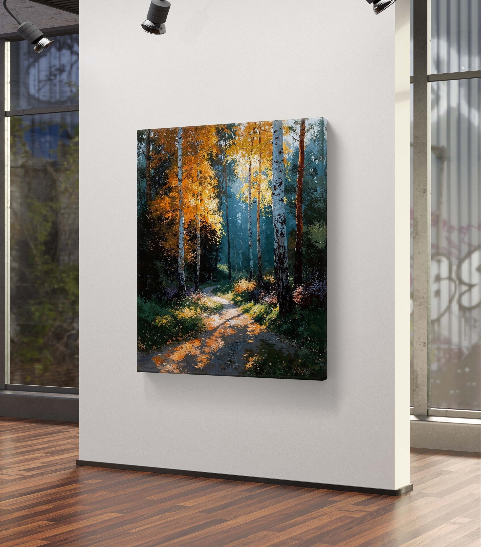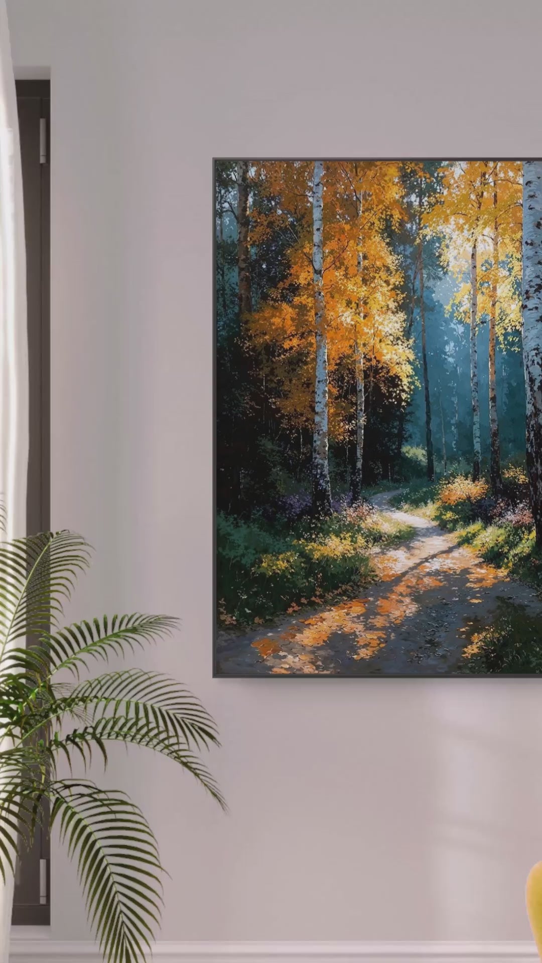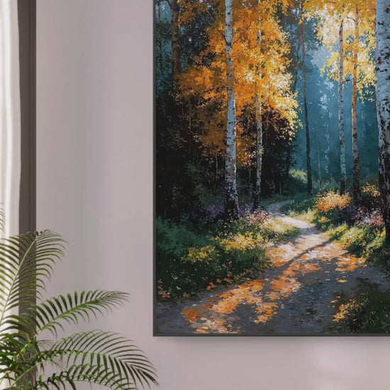 Step into the calm of an autumn morning, where sunlight dances through golden birch leaves and the quiet path leads into the unknown.