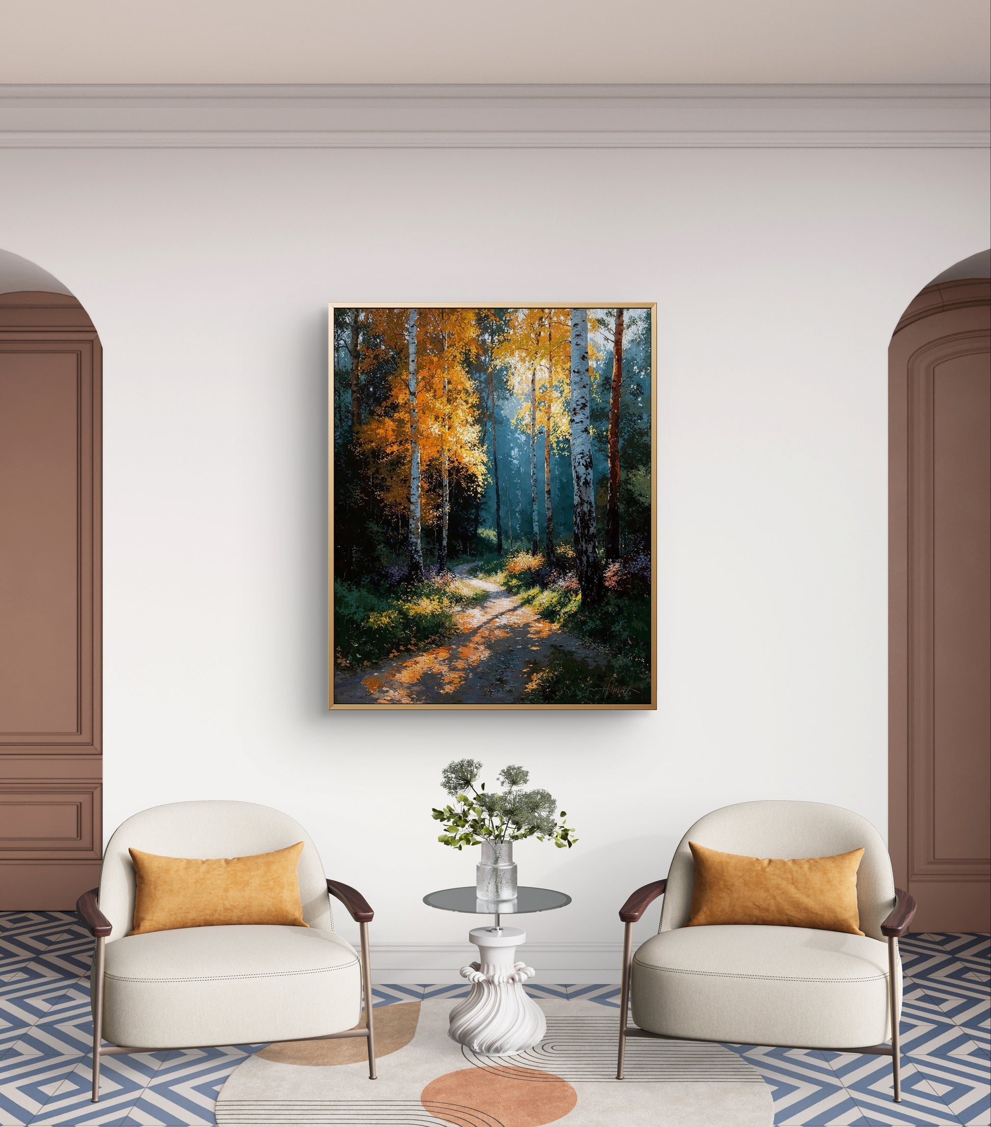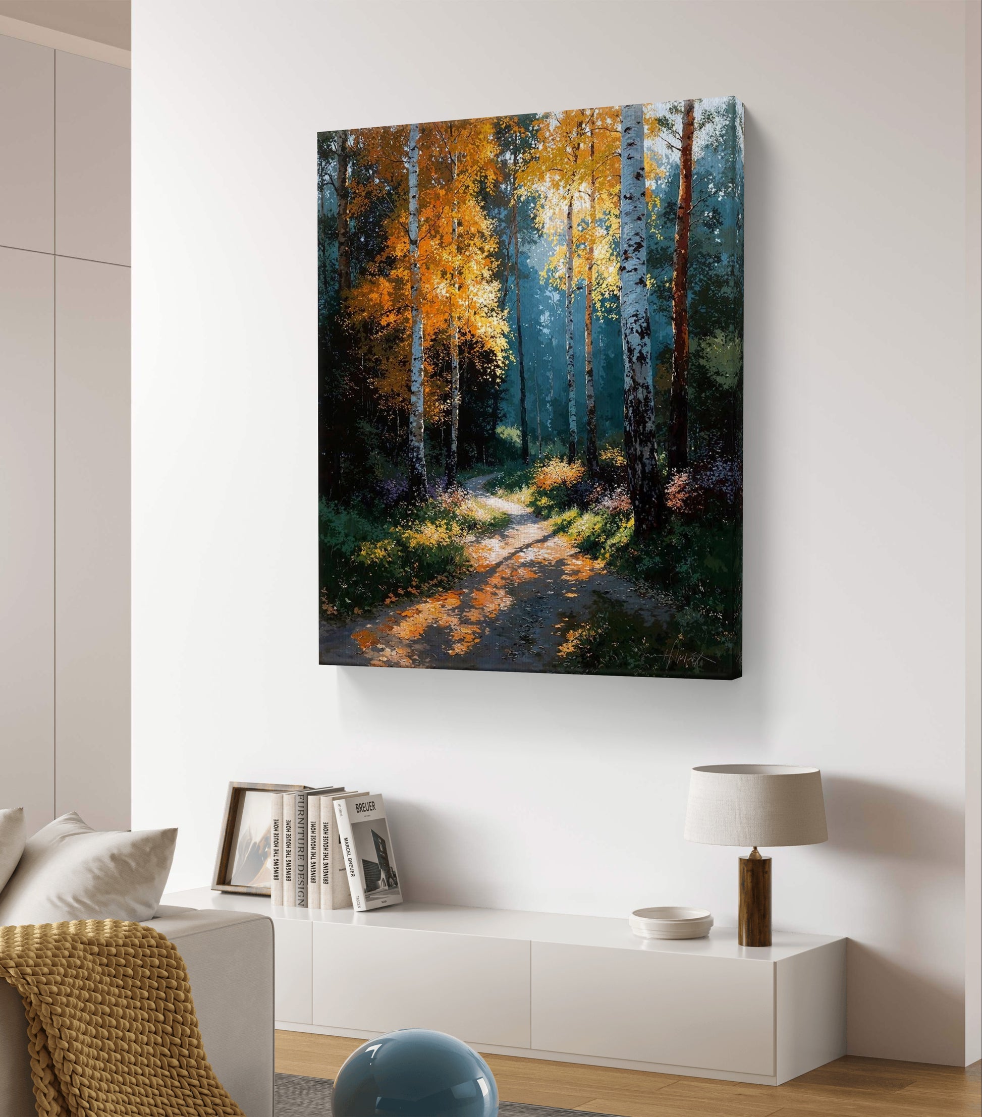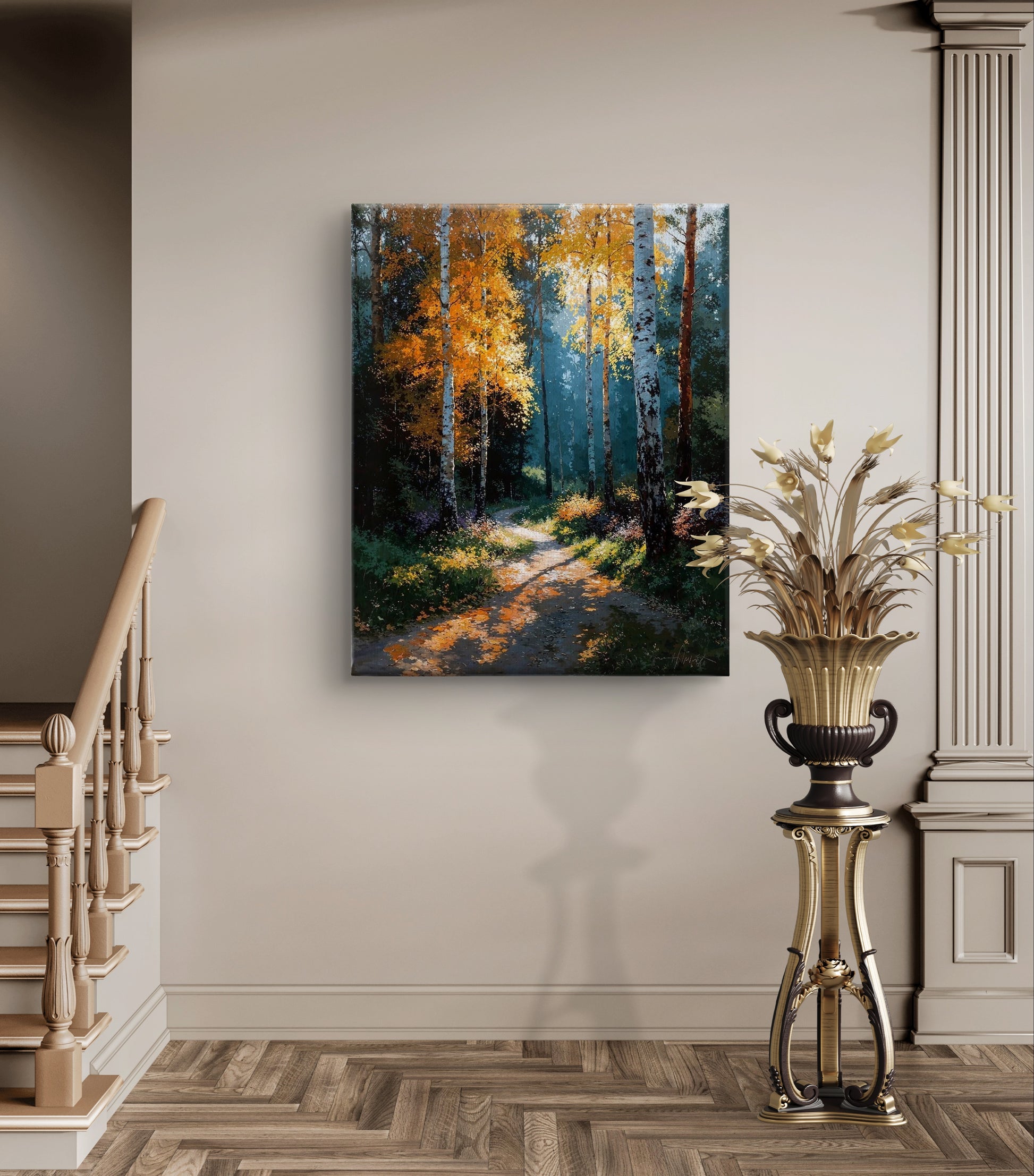 Step into the calm of an autumn morning, where sunlight dances through golden birch leaves and the quiet path leads into the unknown.