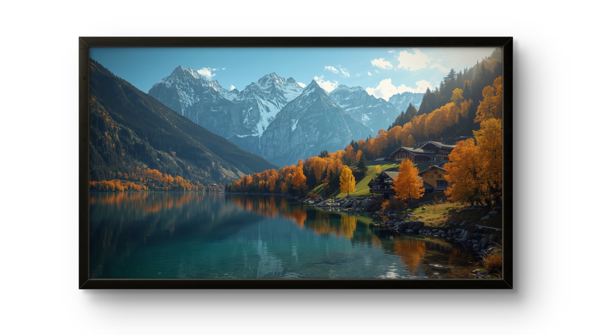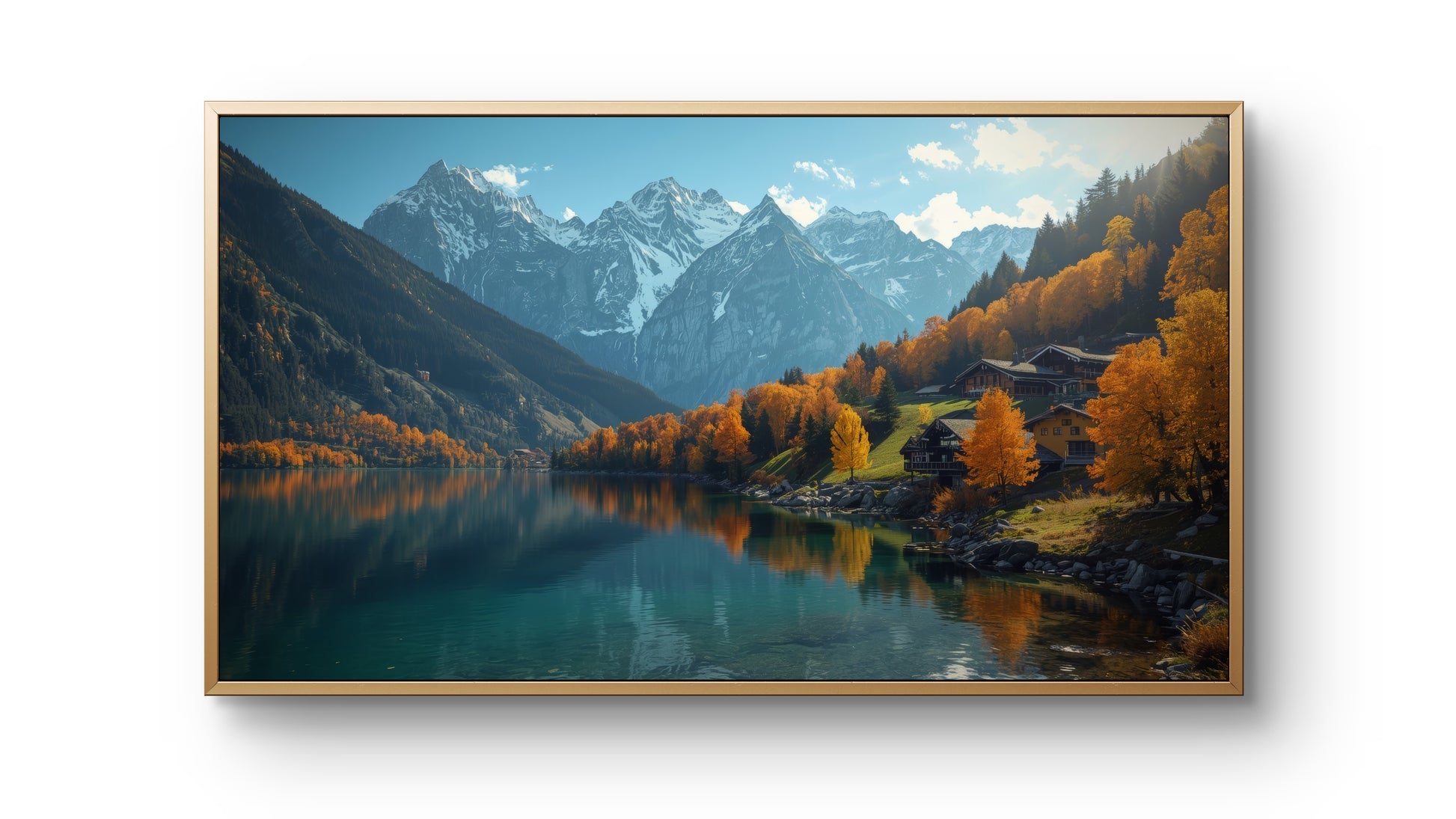 “Golden Silence – Where Mountains Dream” captures a calm alpine lake surrounded by glowing trees and timeless peaks reflected in crystal water.